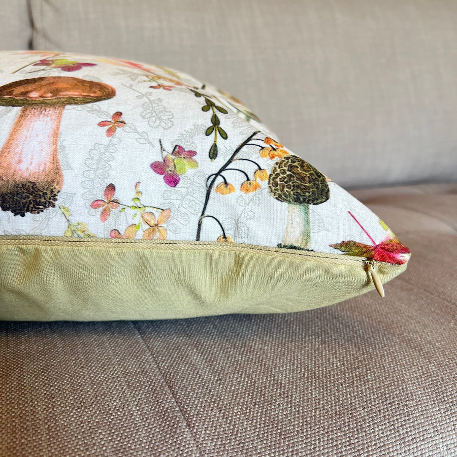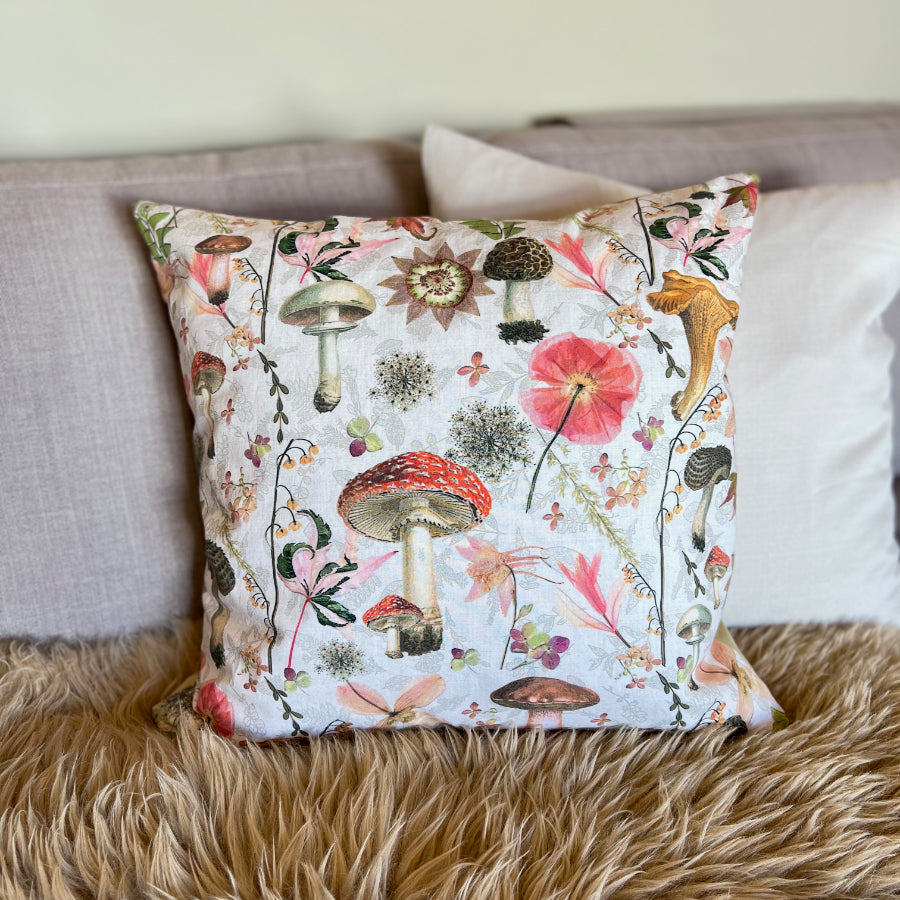 We need MORE mushrooms! This beautiful linen background with mushrooms and florals and more mushrooms makes us happy. This 20x20 cushion cover has cotton fabric front and back.